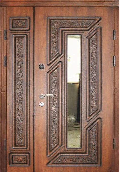 Поскольку в большинстве случаев устанавливаемые на входе в коттедж двустворчатые двери являются еще и предметом интерьера, украшающим здание, их дизайну предается особое значение. Эти двери, как правило, отделываются атмосферостойким МДФ, натуральным шпоном, массивом. Эффектно на таких дверях смотрится витражный узор, применение ковки, зеркальных элементов. Вариантов декора входной двустворчатой двери масса, тут все зависит от пожеланий заказчика.